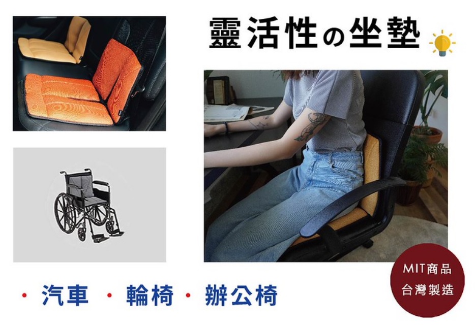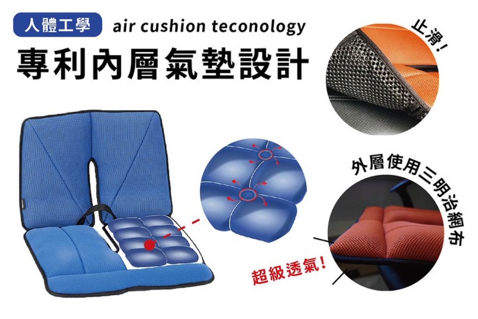 High technology TPU air cushion with valve (FCA-115-30V) x 2 PCs on back for adjust seating pressure and (FCA-106) x 2 PCs on front with recess for breathe and Non-slip design to set up for one seat.