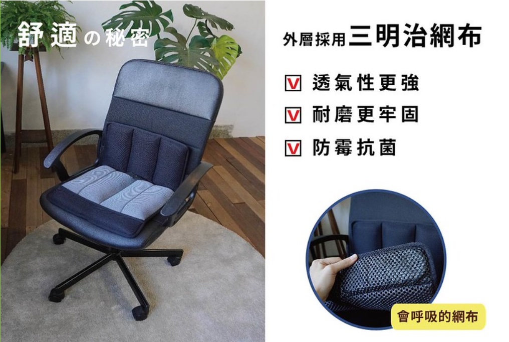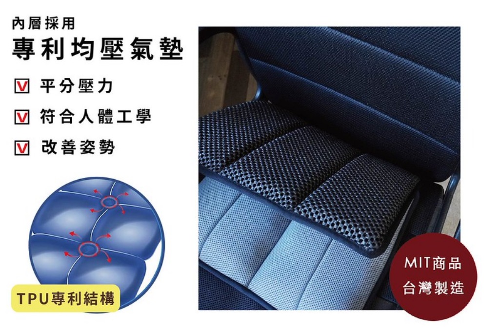 High technology TPU air cushion with valve (FCA-115-30V) x 2 PCs on back for adjust seating pressure and (FCA-106) x 2 PCs on front with recess for breathe and Non-slip design to set up for one seat.