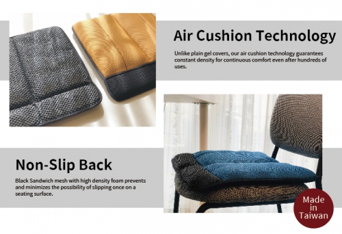 • Air Cushion Technology – Dr. air patented air cushion technology helps ease pain, discomfort and provides consistent support to your existing seat. Unlike plain gel covers, our air cushion technology guarantees constant density for continuous comfort even after hundreds of uses.